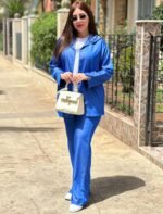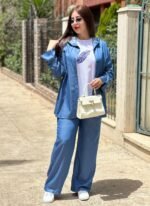 • Ensemble de tencel en 3 pièces (Chemise avec capuche , Pantalon et T-shirt blanc avec des motifs en bleu)